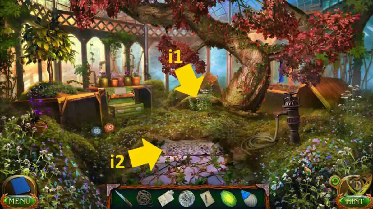 Volte para a estufa, selecione a raiz da árvore (i1) para um close-up e mova a grama para obter a Pomo. Além disso, olhe para a grade (i2) para ver que você precisará de um pé de cabra para movê-la.